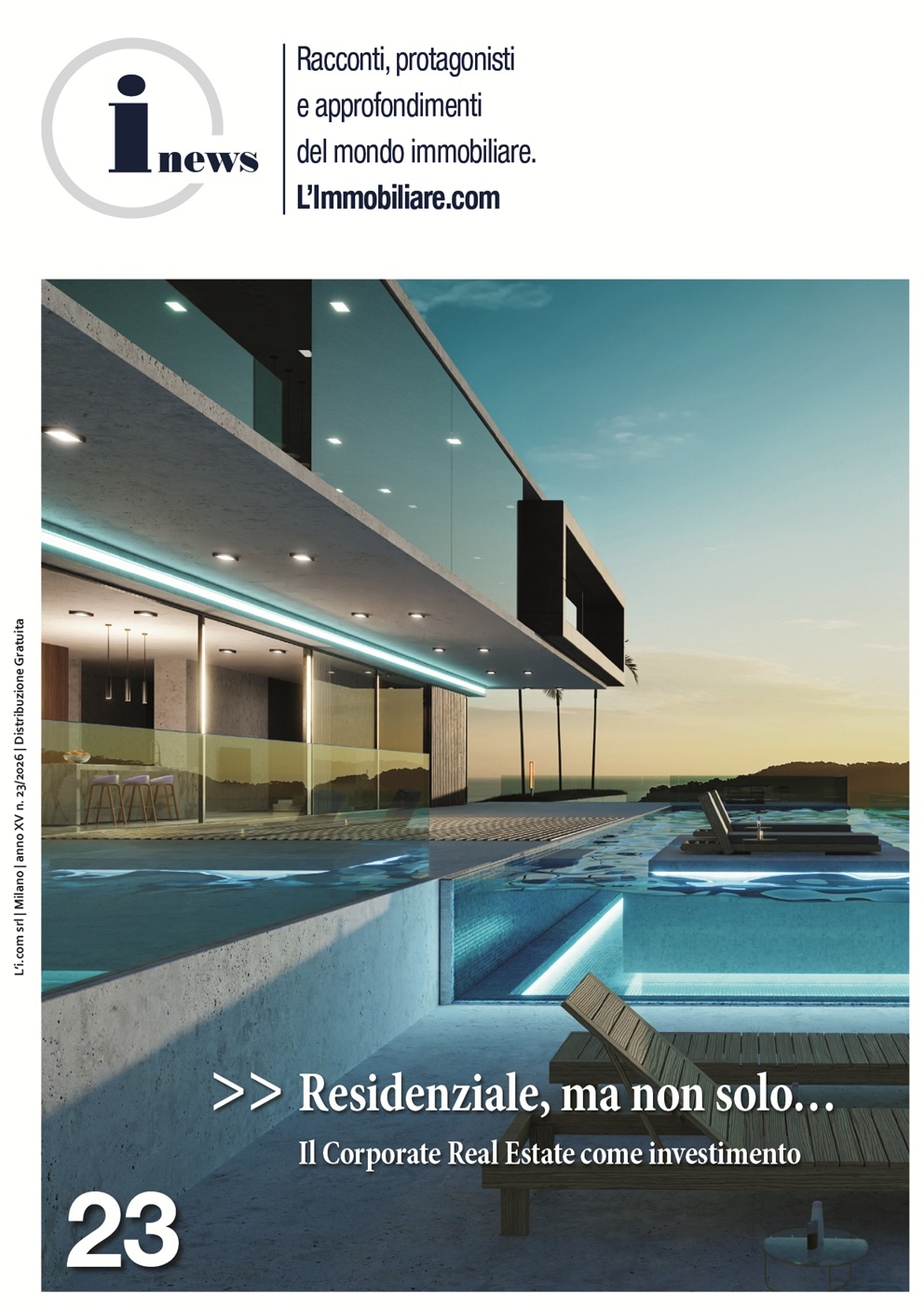 L'IMMOBILIARE.COM è lieta di presentare il nuovissimo numero 23 della rivista INEWS, racconti protagonisti e approfondimenti del mondo immobiliare. La rivista è disponibile gratuitamente presso tutti i punti d'Incontro del Network L'IMMOBILIARE.COM